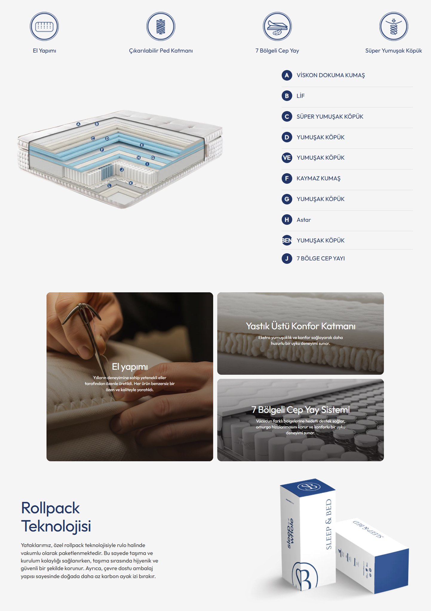 – Katman yapısı: 7-Zone pocket spring sistemi + super soft foam + konfor katmanları