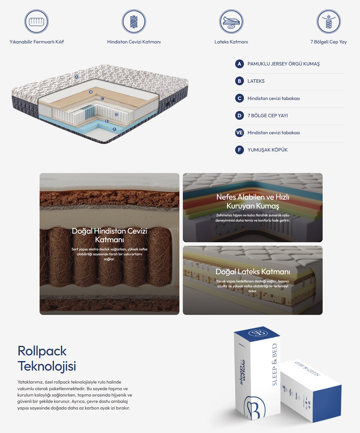 – Doğal kauçuk (rubber) katmanlar: Vücudu sarar, baskı noktalarını dengeler.